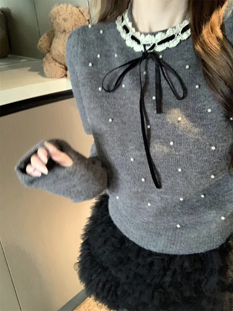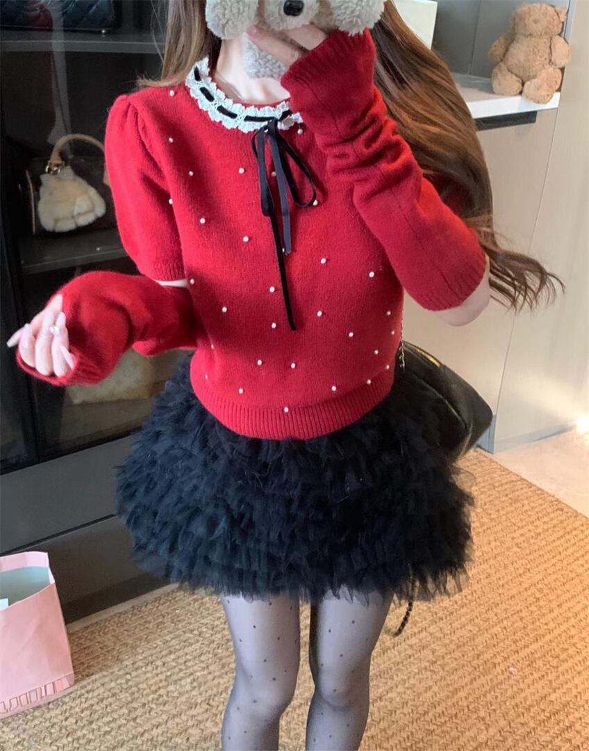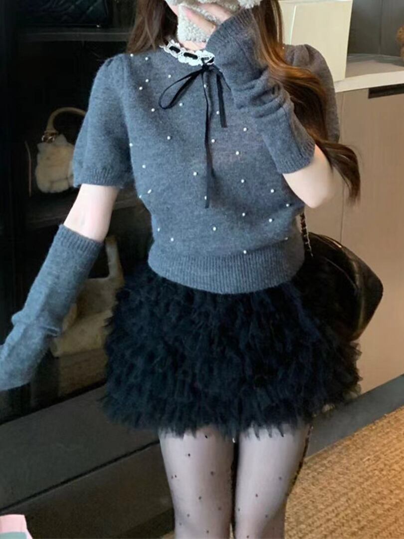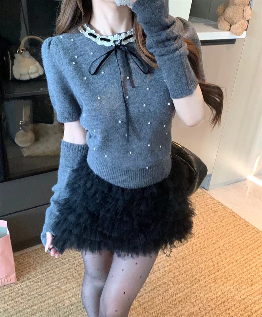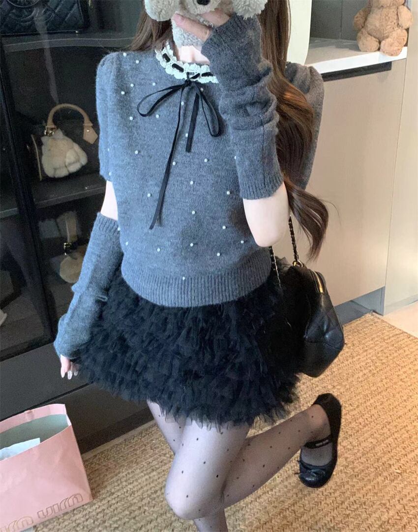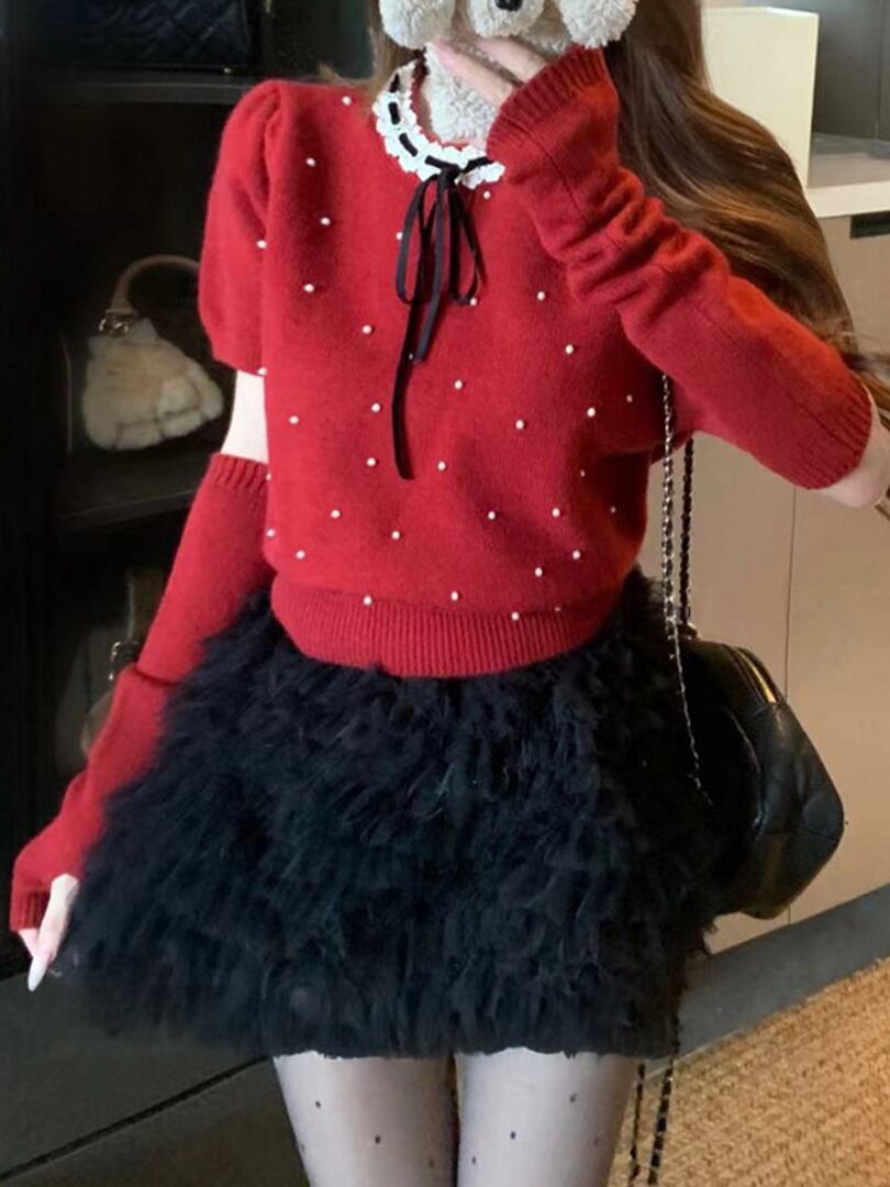 アームウォーマー付きパールガーリーニットトップス LK1817