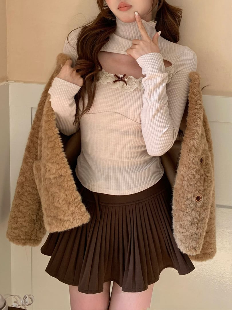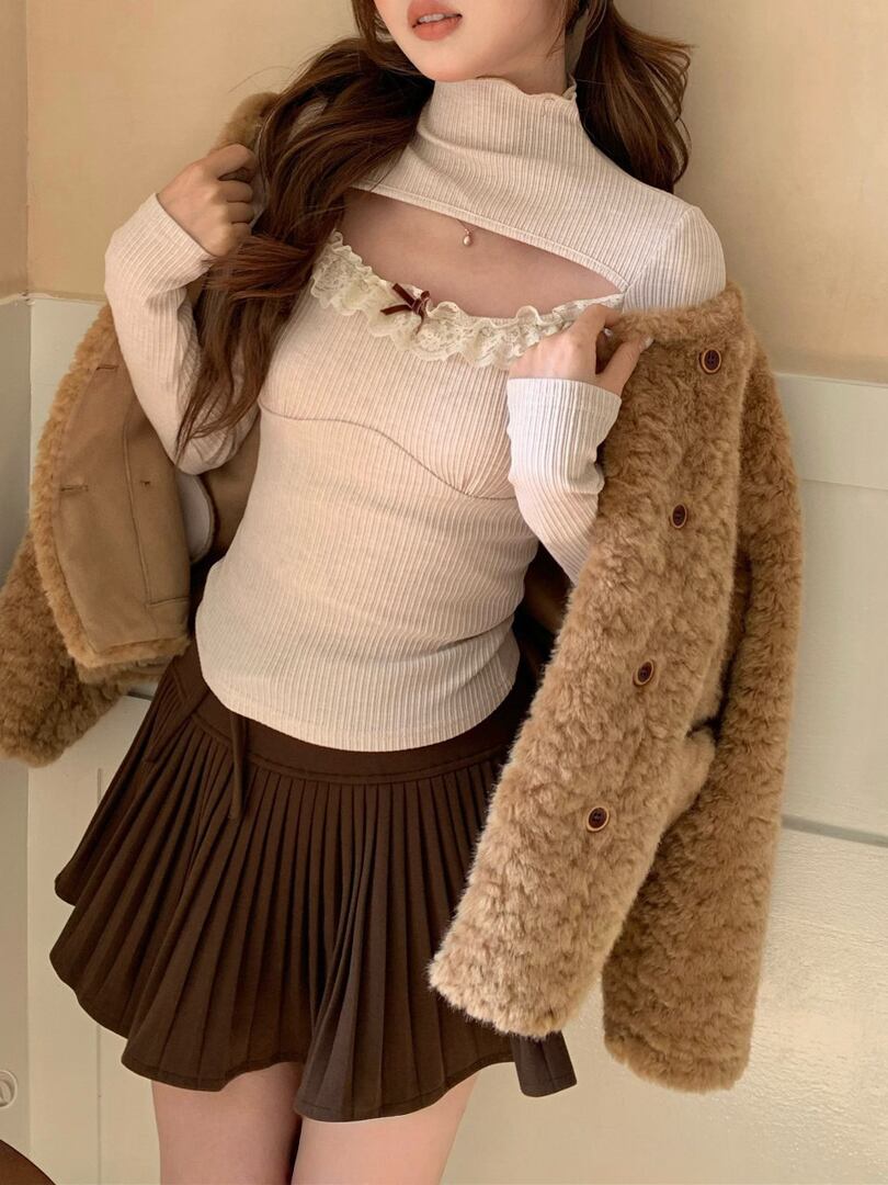 繊細なレース切替と、デコルテを美しく見せるデザインが印象的なハイネックトップス。