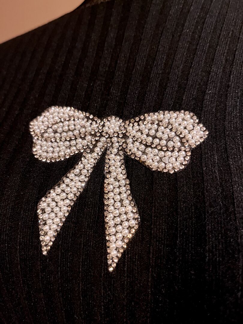 パールとラインストーンで装飾されたリボンモチーフがポイントのアイテムです。